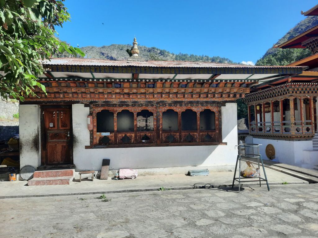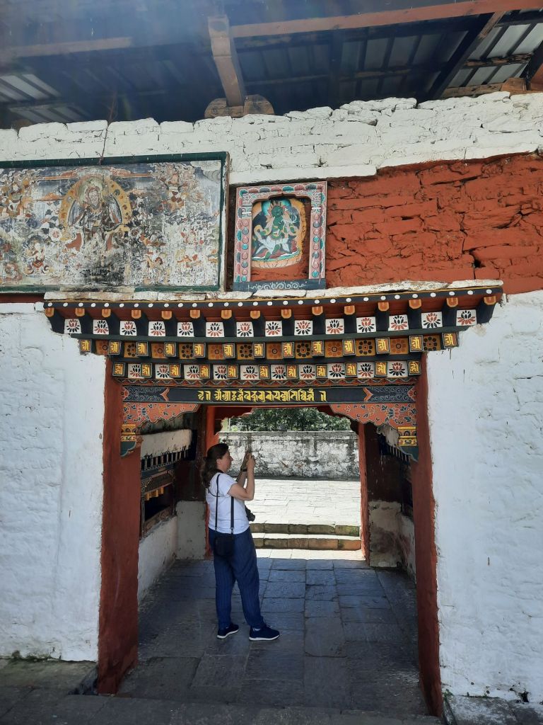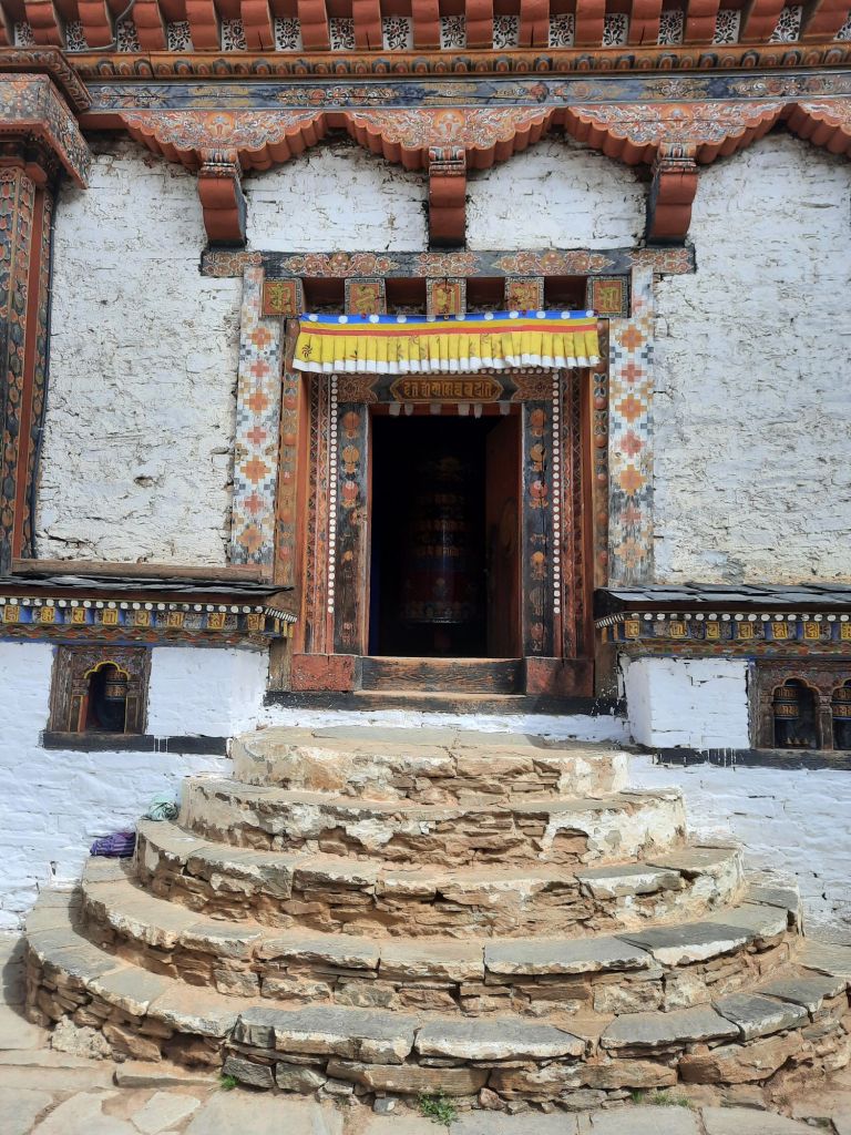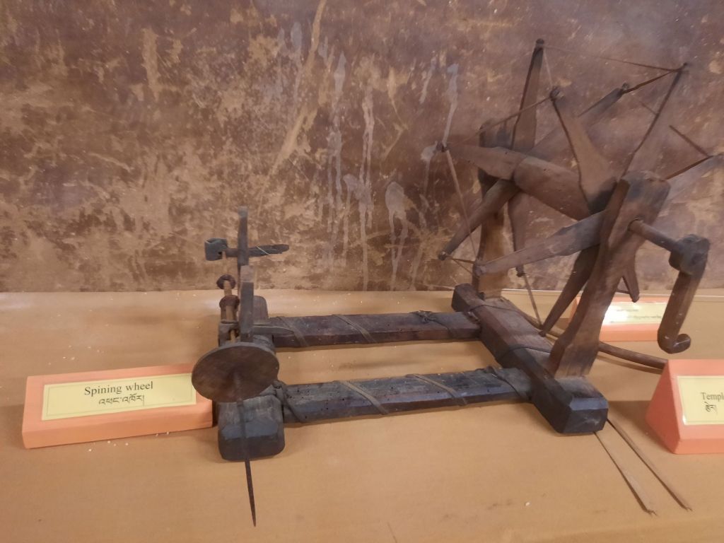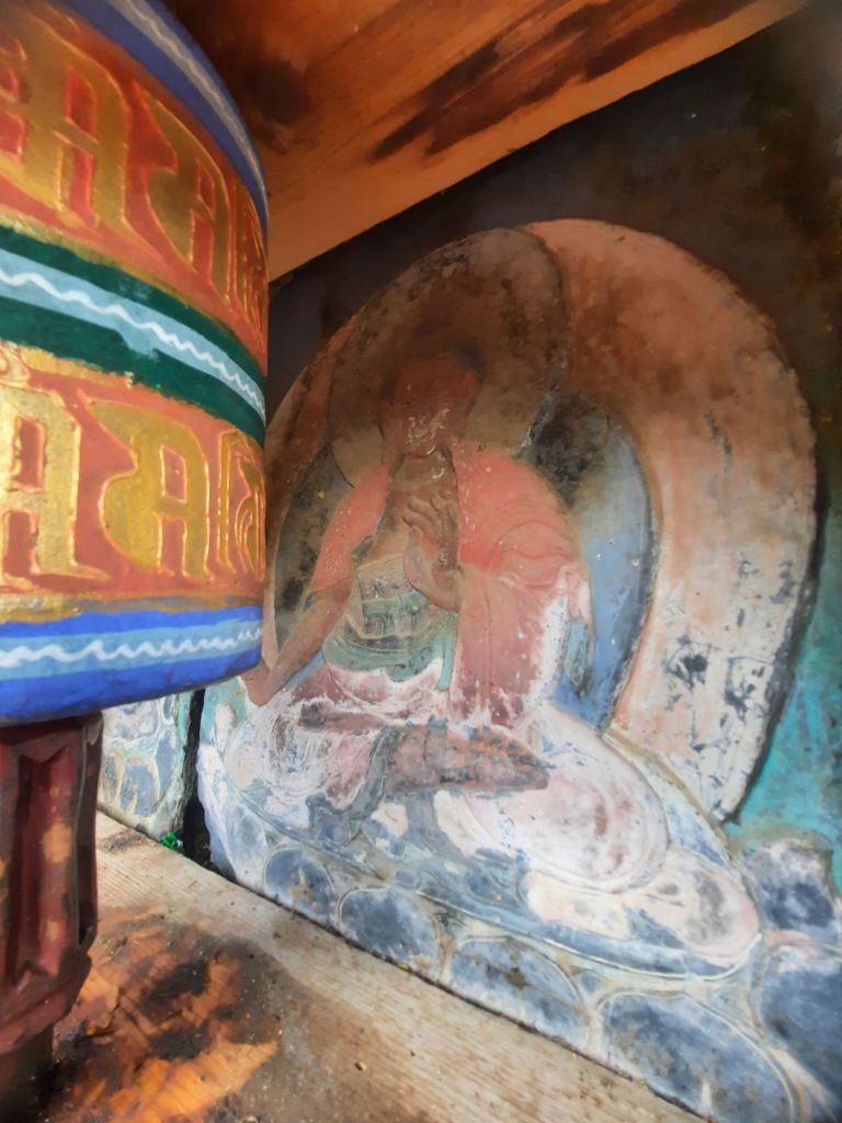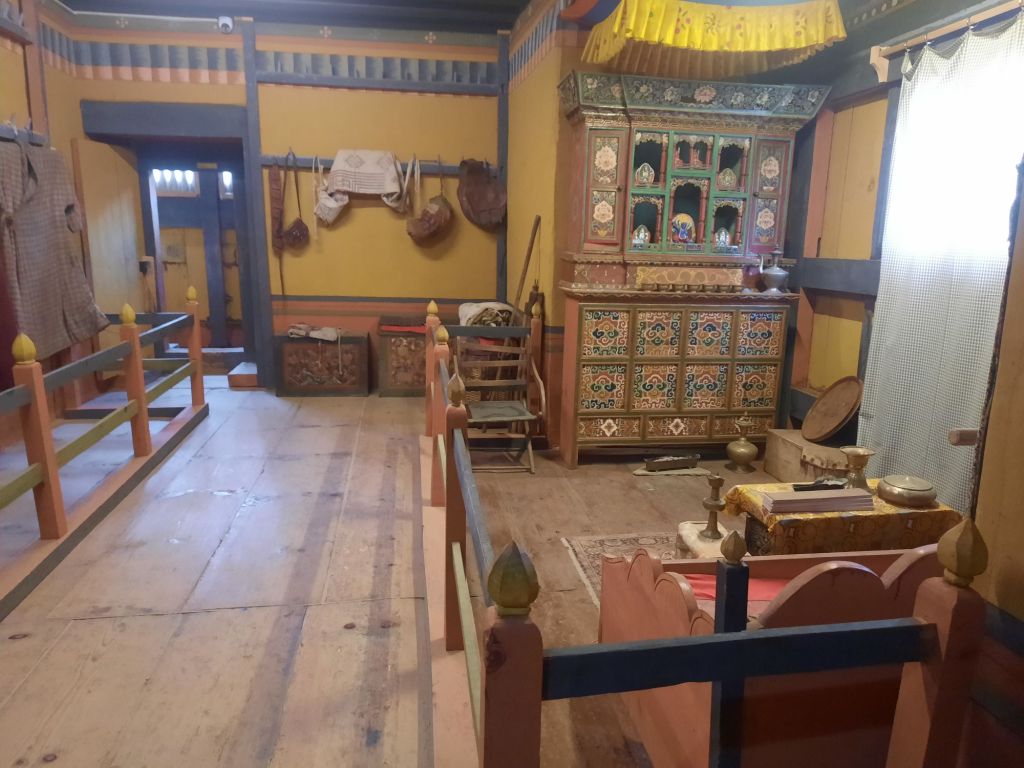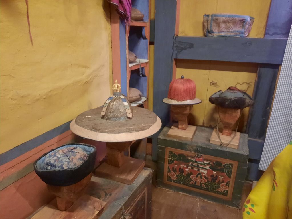 Dan verder over slingerweg omhoog. Hoog op de beg staat het huis van een grote Tibetaanse meester die in de 14de eeuw naar Buthan kwam. Longchen Rabjám bouwde hier een groot complex. De familie woonde hier eeuwen lang. De kinderen van de laatste generatie besloot te gaan studeren. Na de studie keerde ze terug en besloten het huis op te knappen en er een museum van te maken. Zeer mooi opgezet . 3 verdiepingen vh huis is te bezichtigen met een houten steile trap. Achter de gebedsrollen staan hier zeer oude klei tabletten met verschillende Boeddha’s.