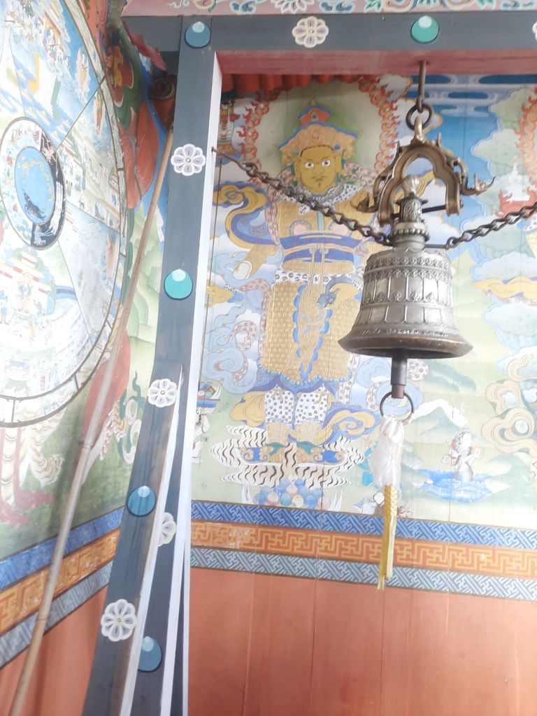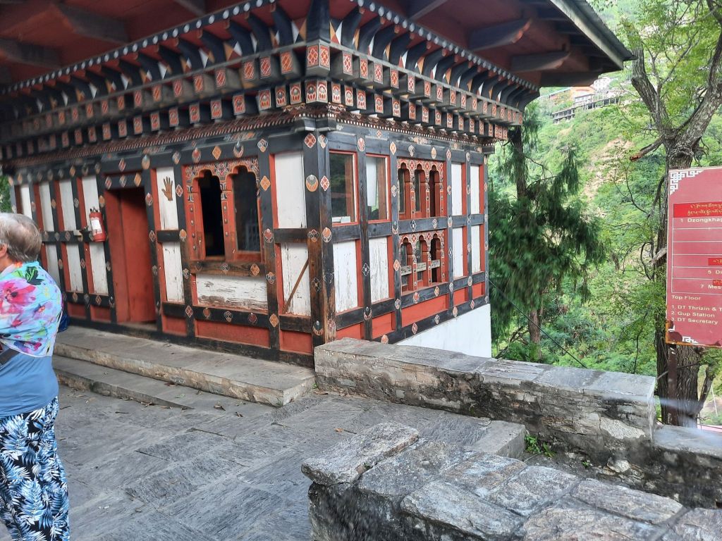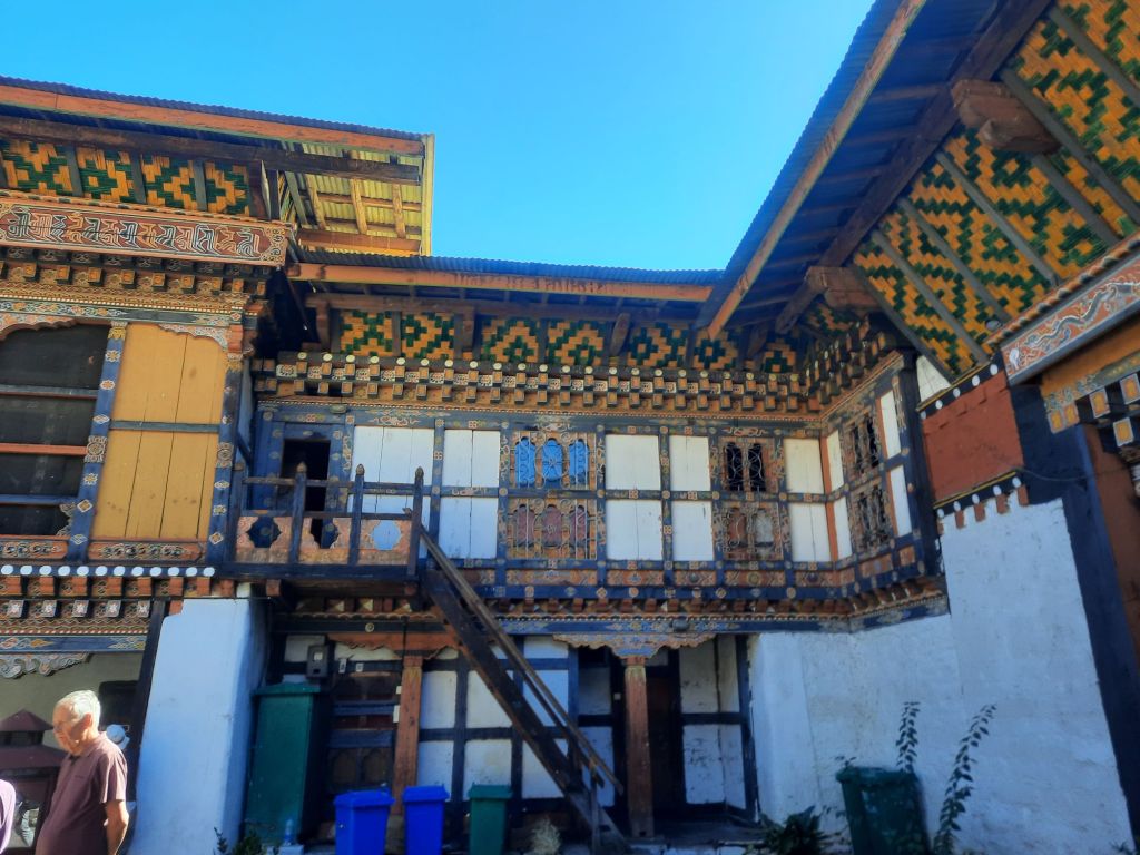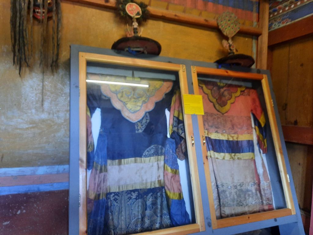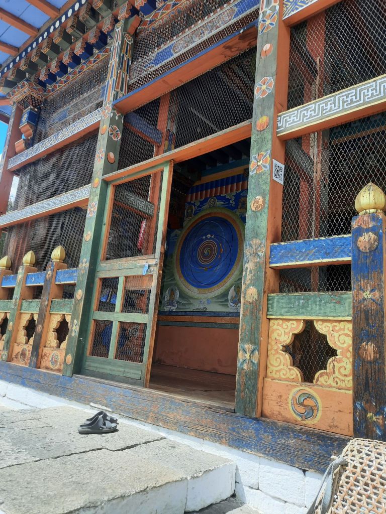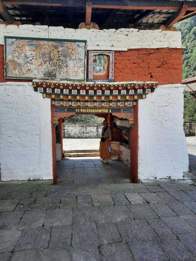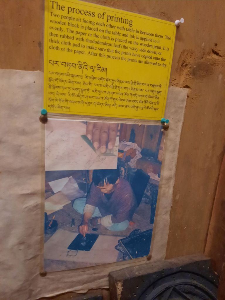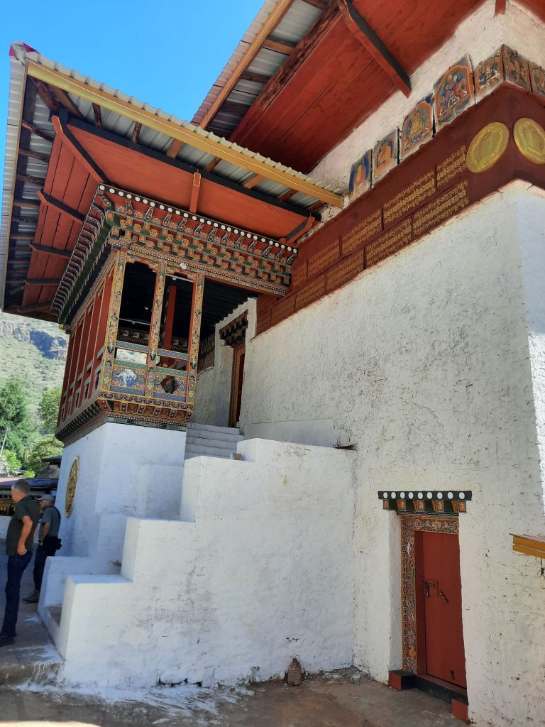 Dan verder over slingerweg omhoog. Hoog op de beg staat het huis van een grote Tibetaanse meester die in de 14de eeuw naar Buthan kwam. Longchen Rabjám bouwde hier een groot complex. De familie woonde hier eeuwen lang. De kinderen van de laatste generatie besloot te gaan studeren. Na de studie keerde ze terug en besloten het huis op te knappen en er een museum van te maken. Zeer mooi opgezet . 3 verdiepingen vh huis is te bezichtigen met een houten steile trap. Achter de gebedsrollen staan hier zeer oude klei tabletten met verschillende Boeddha’s.