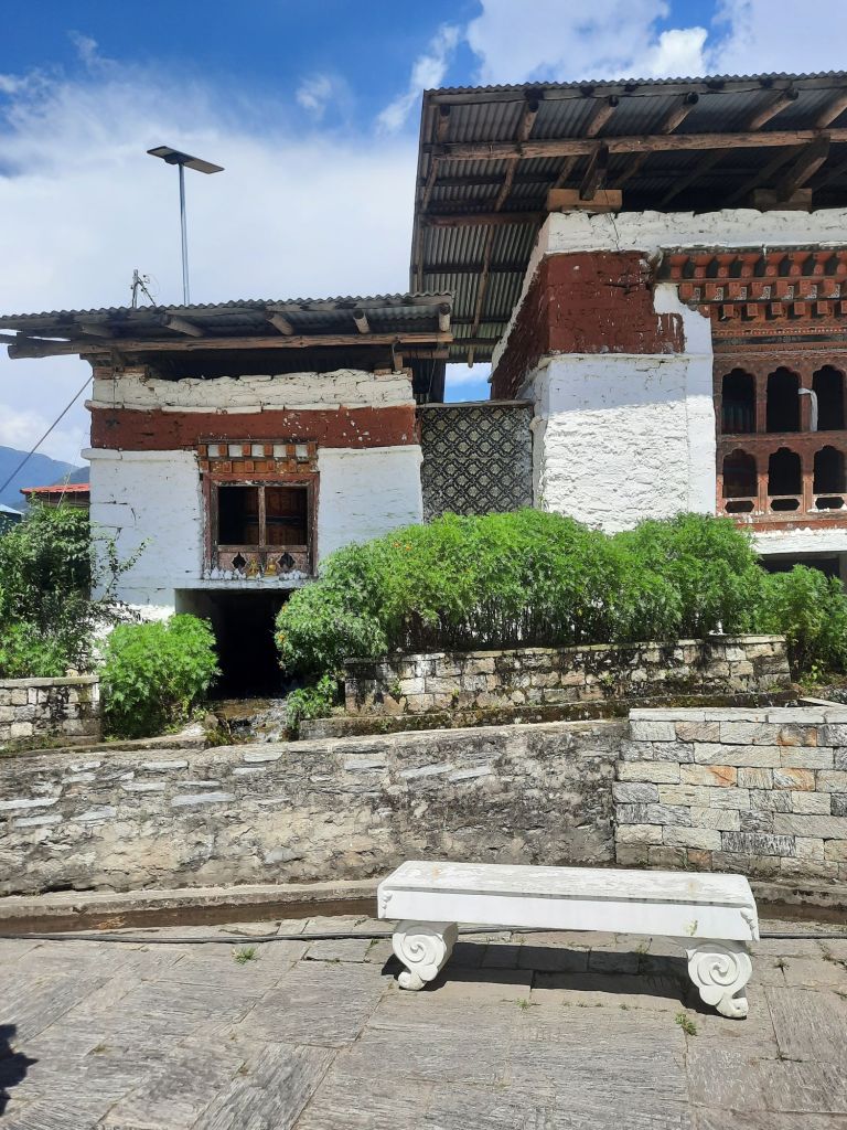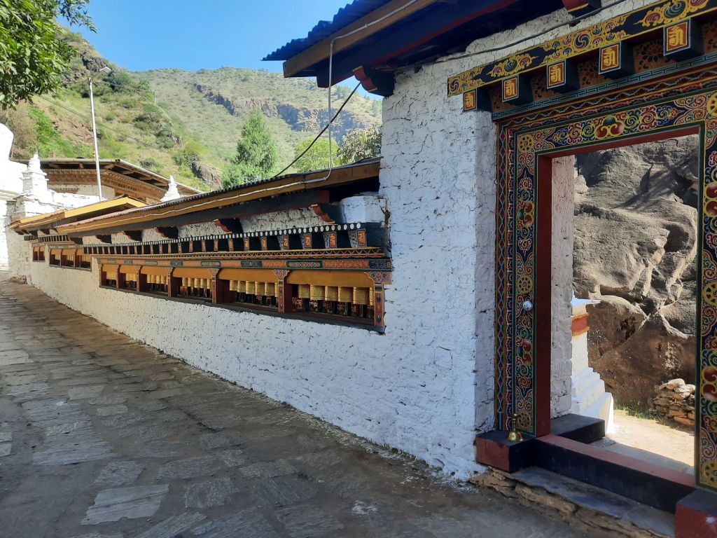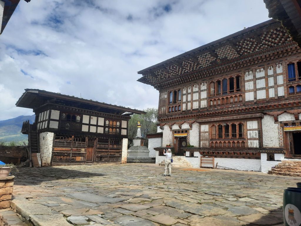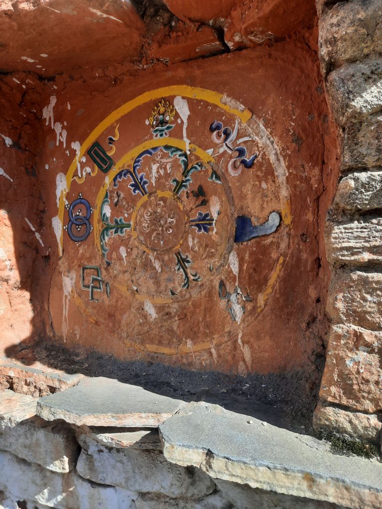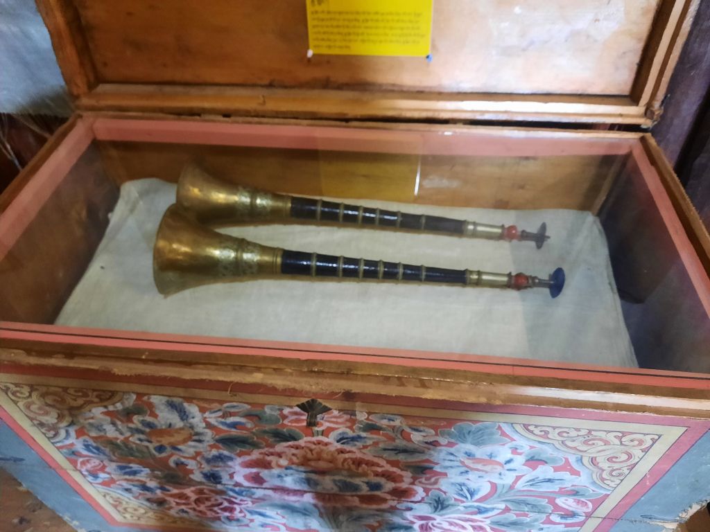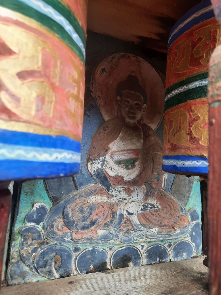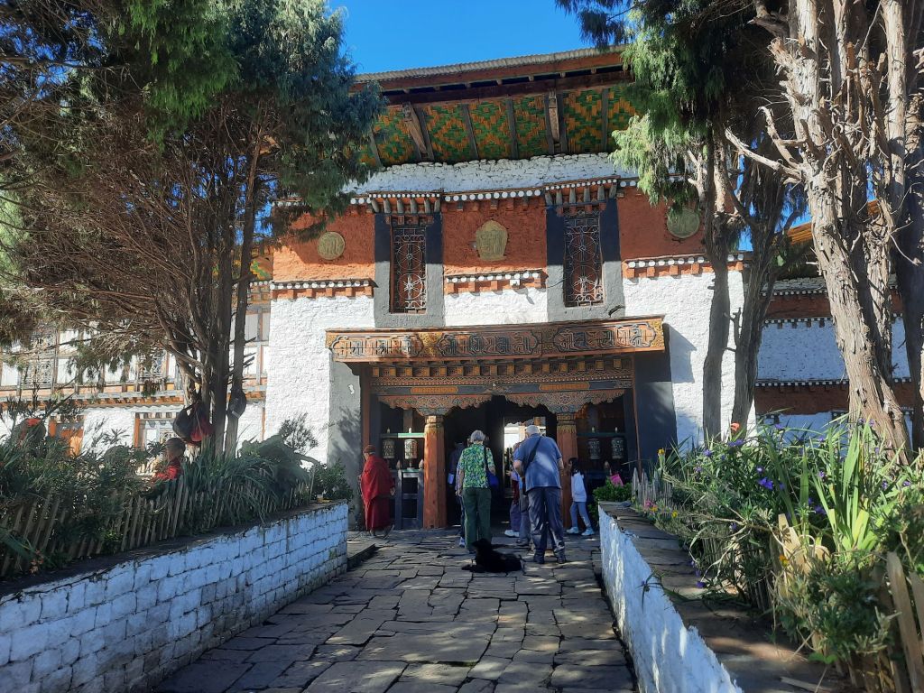 Dan verder over slingerweg omhoog. Hoog op de beg staat het huis van een grote Tibetaanse meester die in de 14de eeuw naar Buthan kwam. Longchen Rabjám bouwde hier een groot complex. De familie woonde hier eeuwen lang. De kinderen van de laatste generatie besloot te gaan studeren. Na de studie keerde ze terug en besloten het huis op te knappen en er een museum van te maken. Zeer mooi opgezet . 3 verdiepingen vh huis is te bezichtigen met een houten steile trap. Achter de gebedsrollen staan hier zeer oude klei tabletten met verschillende Boeddha’s.