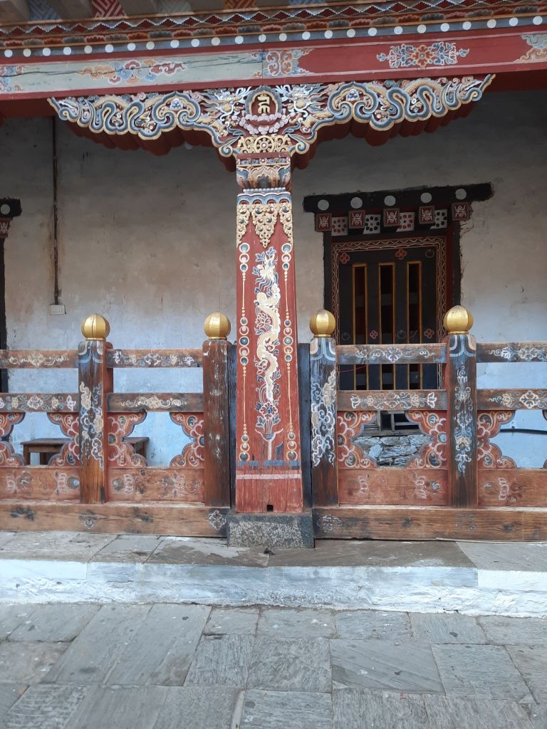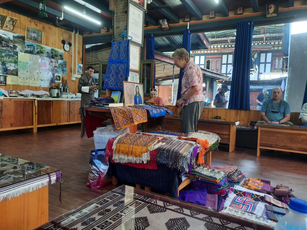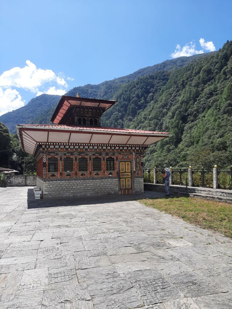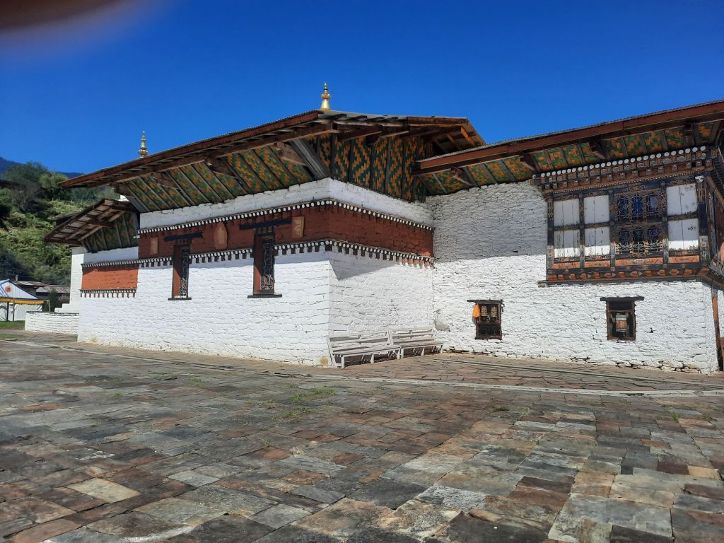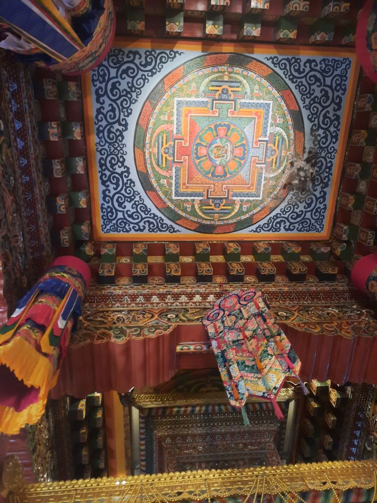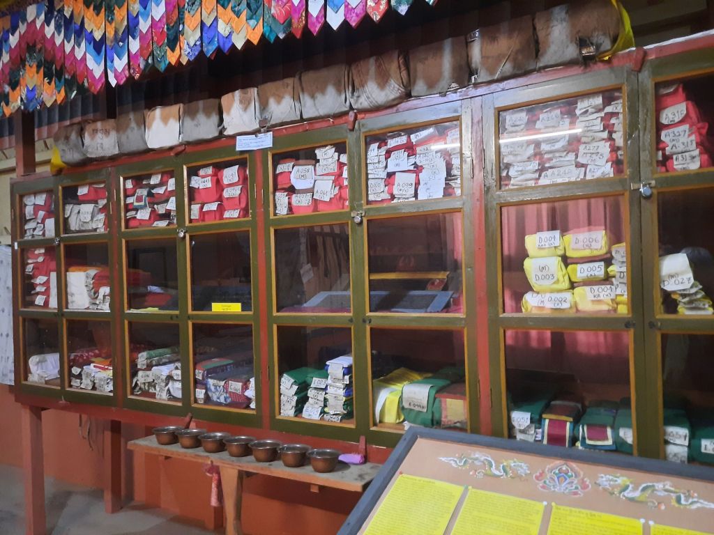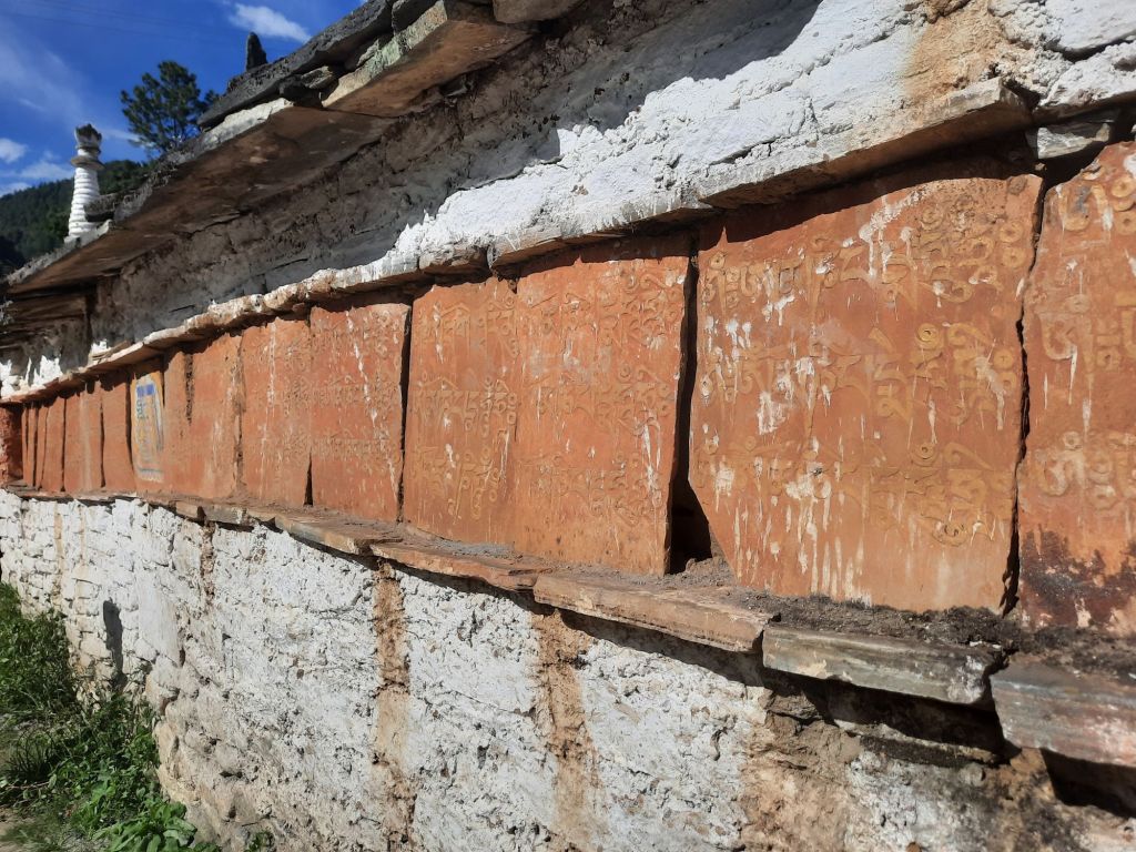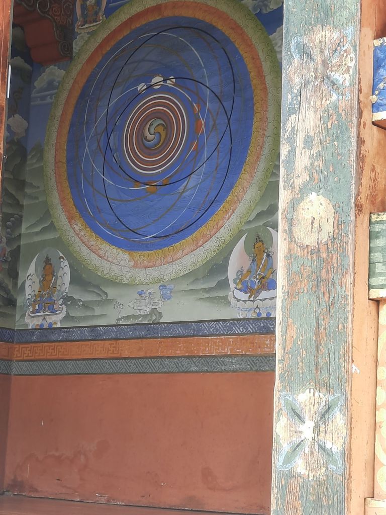 Dan verder over slingerweg omhoog. Hoog op de beg staat het huis van een grote Tibetaanse meester die in de 14de eeuw naar Buthan kwam. Longchen Rabjám bouwde hier een groot complex. De familie woonde hier eeuwen lang. De kinderen van de laatste generatie besloot te gaan studeren. Na de studie keerde ze terug en besloten het huis op te knappen en er een museum van te maken. Zeer mooi opgezet . 3 verdiepingen vh huis is te bezichtigen met een houten steile trap. Achter de gebedsrollen staan hier zeer oude klei tabletten met verschillende Boeddha’s.