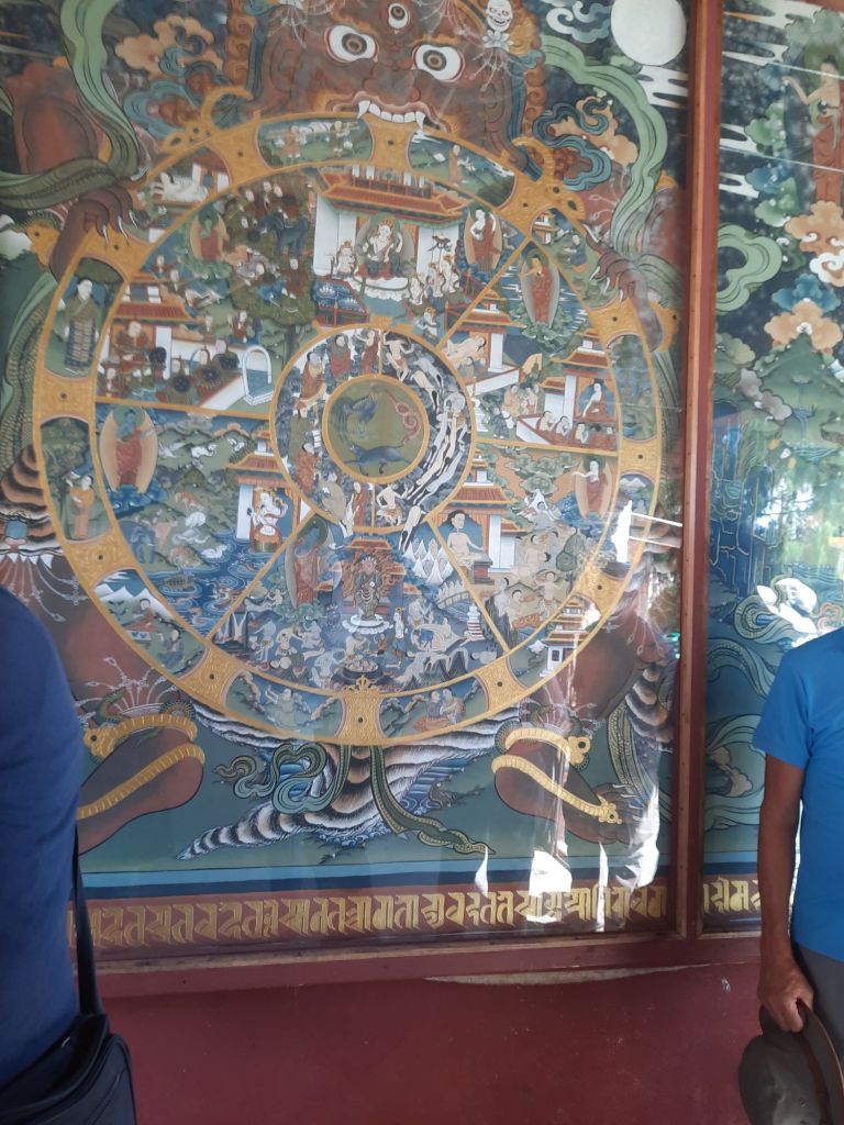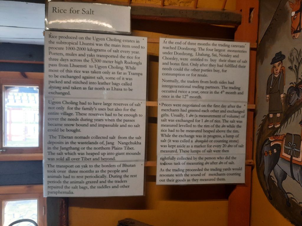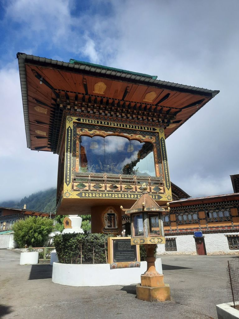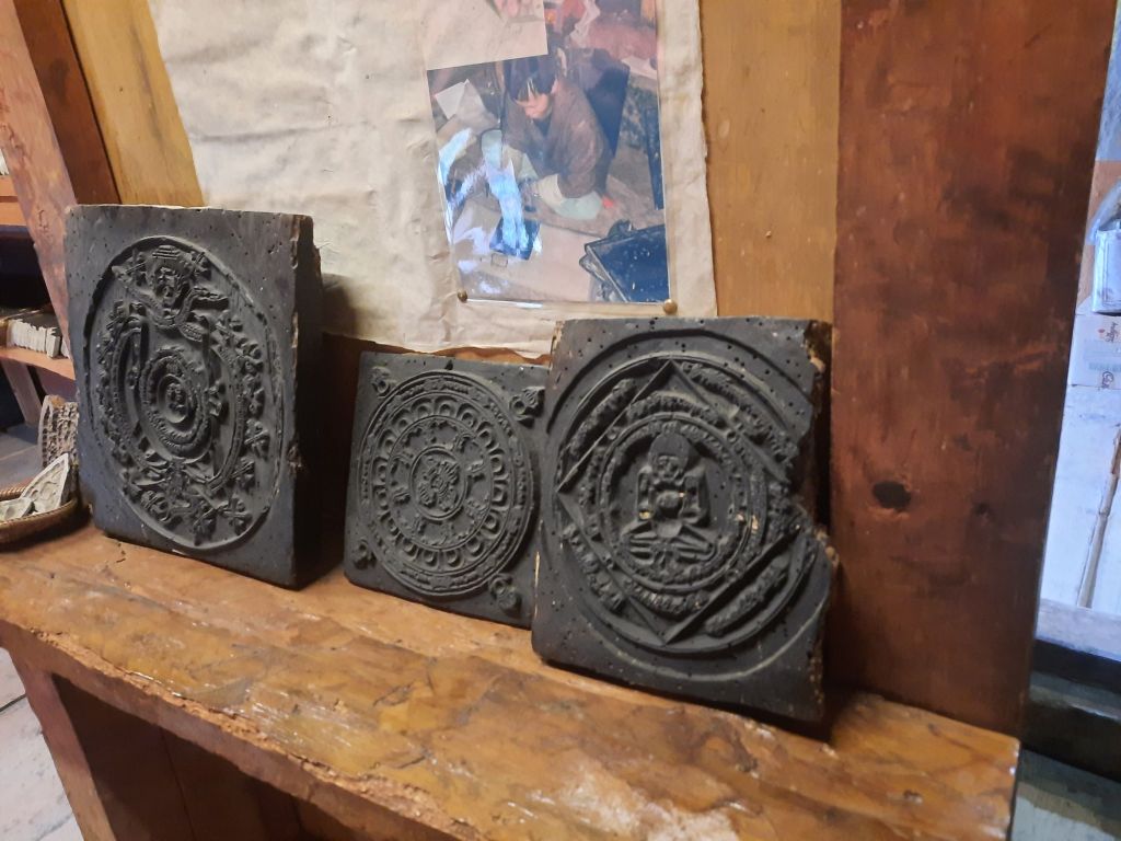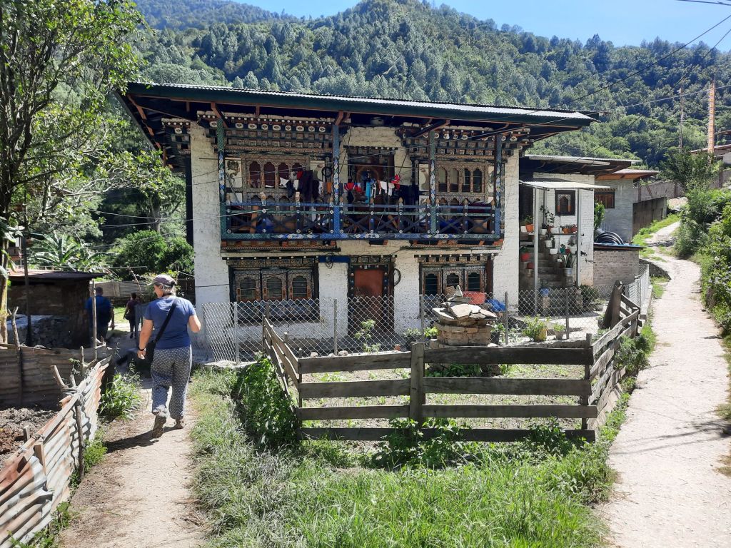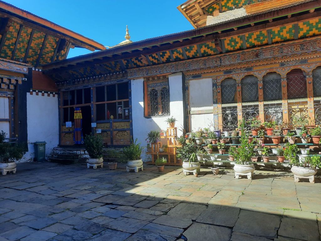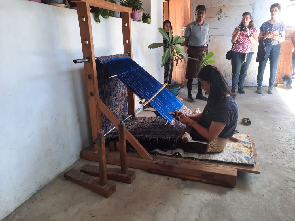 Dan verder over slingerweg omhoog. Hoog op de beg staat het huis van een grote Tibetaanse meester die in de 14de eeuw naar Buthan kwam. Longchen Rabjám bouwde hier een groot complex. De familie woonde hier eeuwen lang. De kinderen van de laatste generatie besloot te gaan studeren. Na de studie keerde ze terug en besloten het huis op te knappen en er een museum van te maken. Zeer mooi opgezet . 3 verdiepingen vh huis is te bezichtigen met een houten steile trap. Achter de gebedsrollen staan hier zeer oude klei tabletten met verschillende Boeddha’s.
