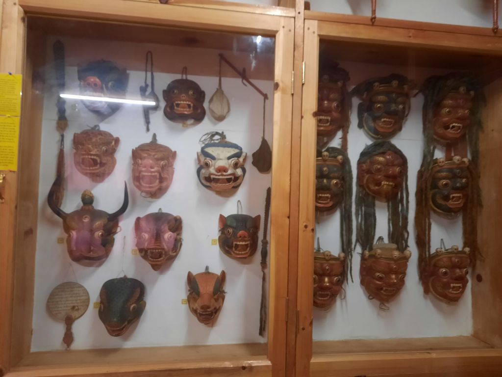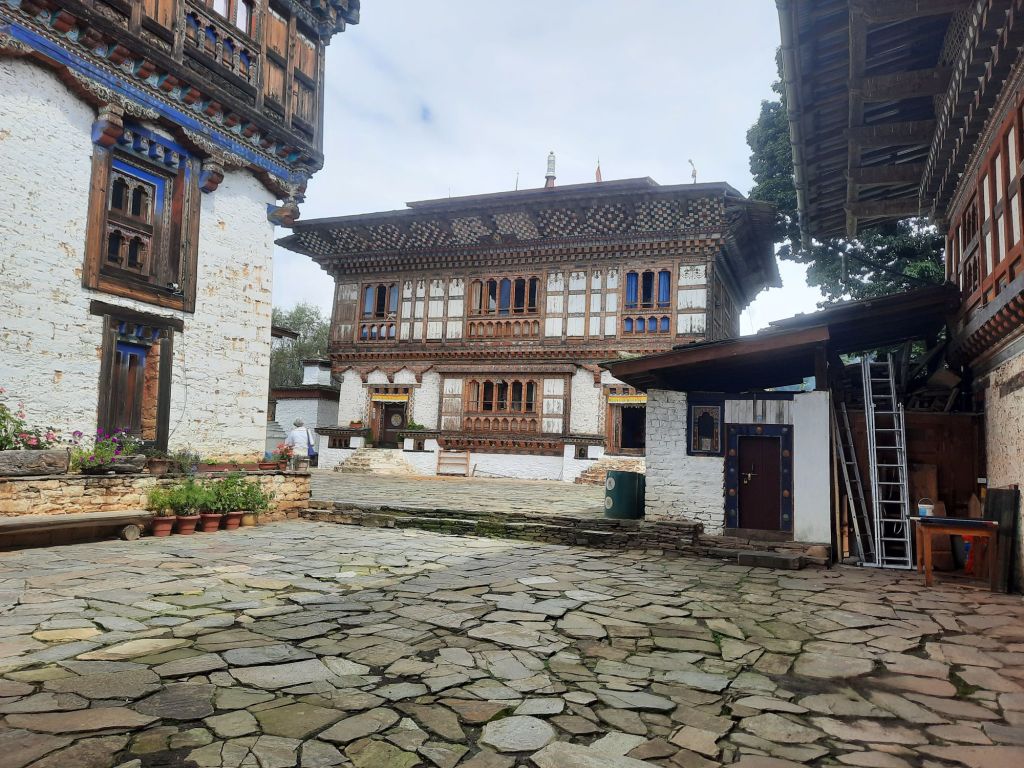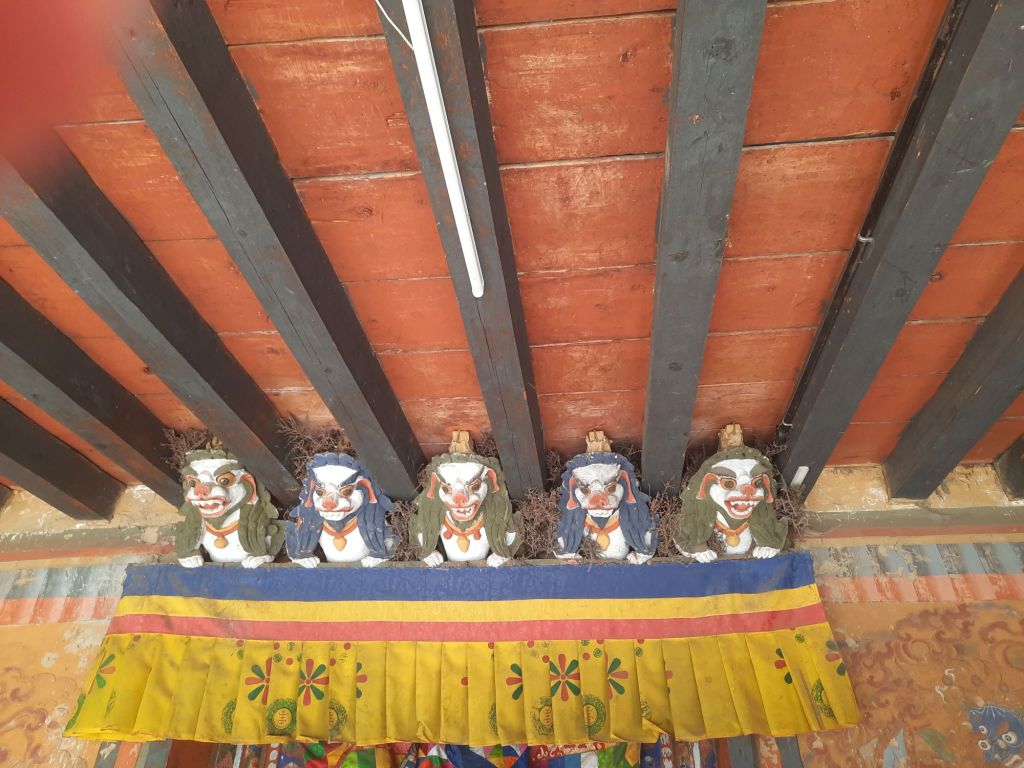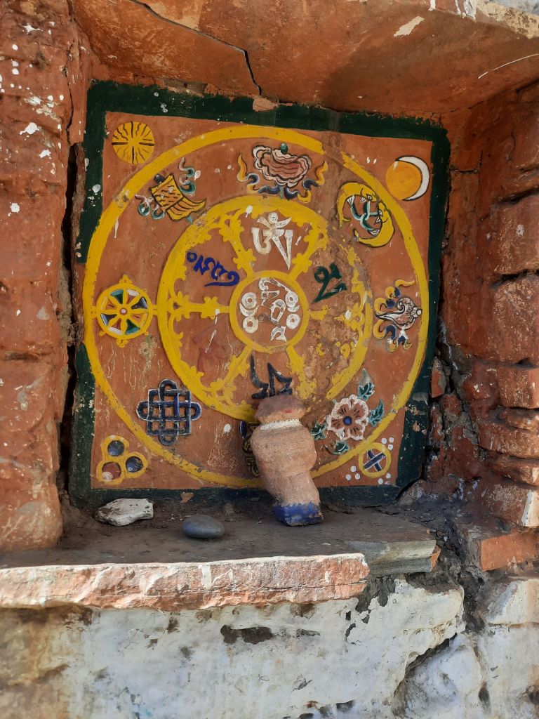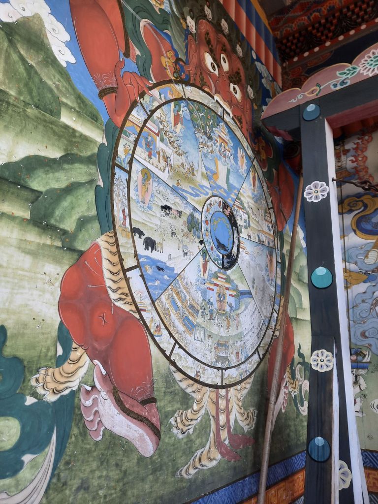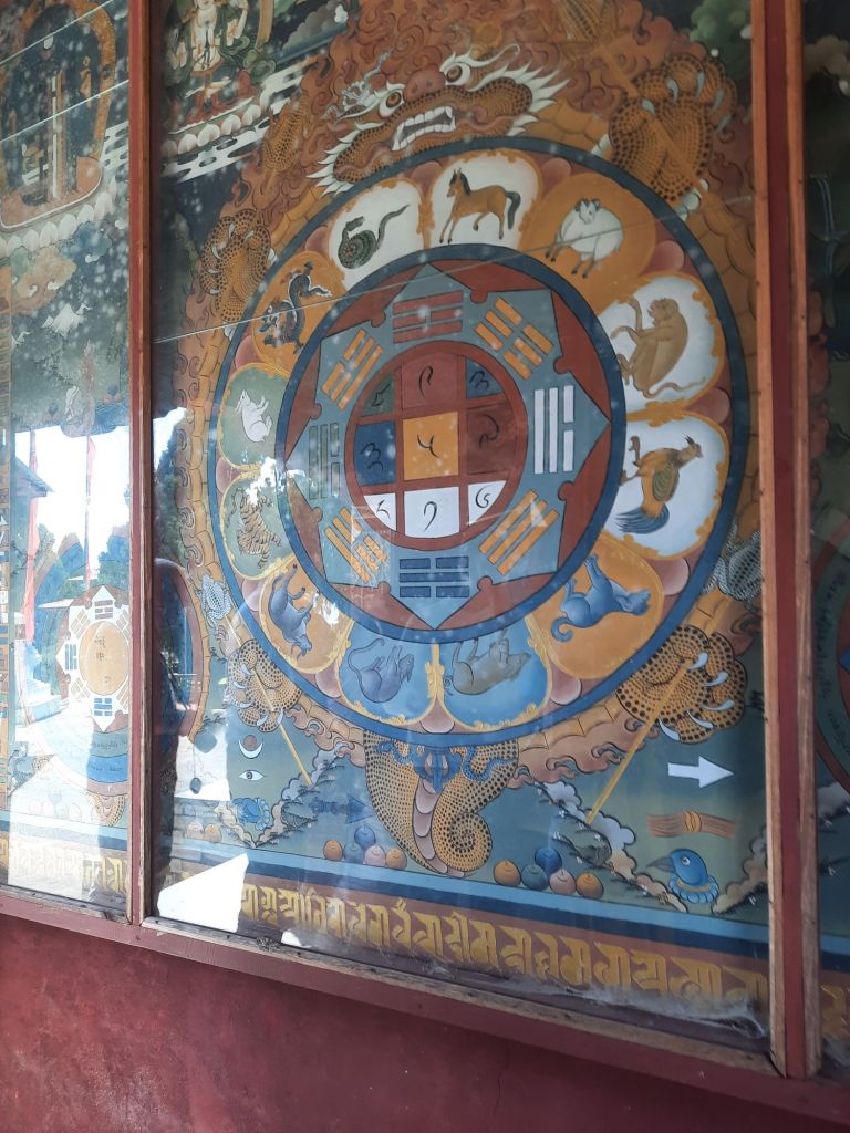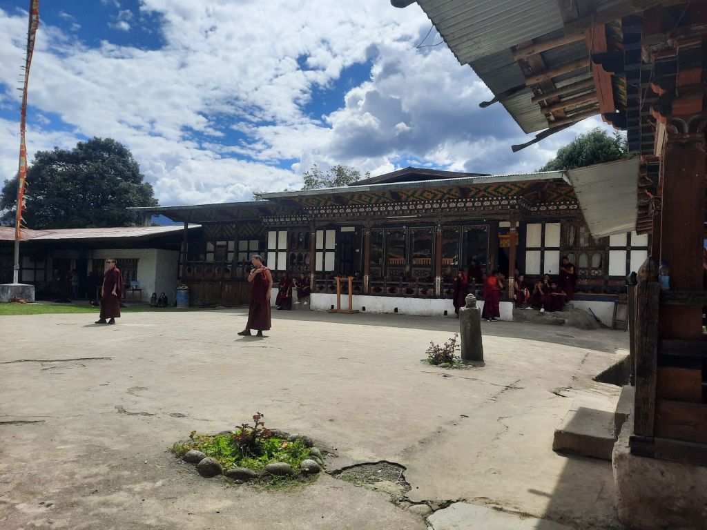 Dan verder over slingerweg omhoog. Hoog op de beg staat het huis van een grote Tibetaanse meester die in de 14de eeuw naar Buthan kwam. Longchen Rabjám bouwde hier een groot complex. De familie woonde hier eeuwen lang. De kinderen van de laatste generatie besloot te gaan studeren. Na de studie keerde ze terug en besloten het huis op te knappen en er een museum van te maken. Zeer mooi opgezet . 3 verdiepingen vh huis is te bezichtigen met een houten steile trap. Achter de gebedsrollen staan hier zeer oude klei tabletten met verschillende Boeddha’s.