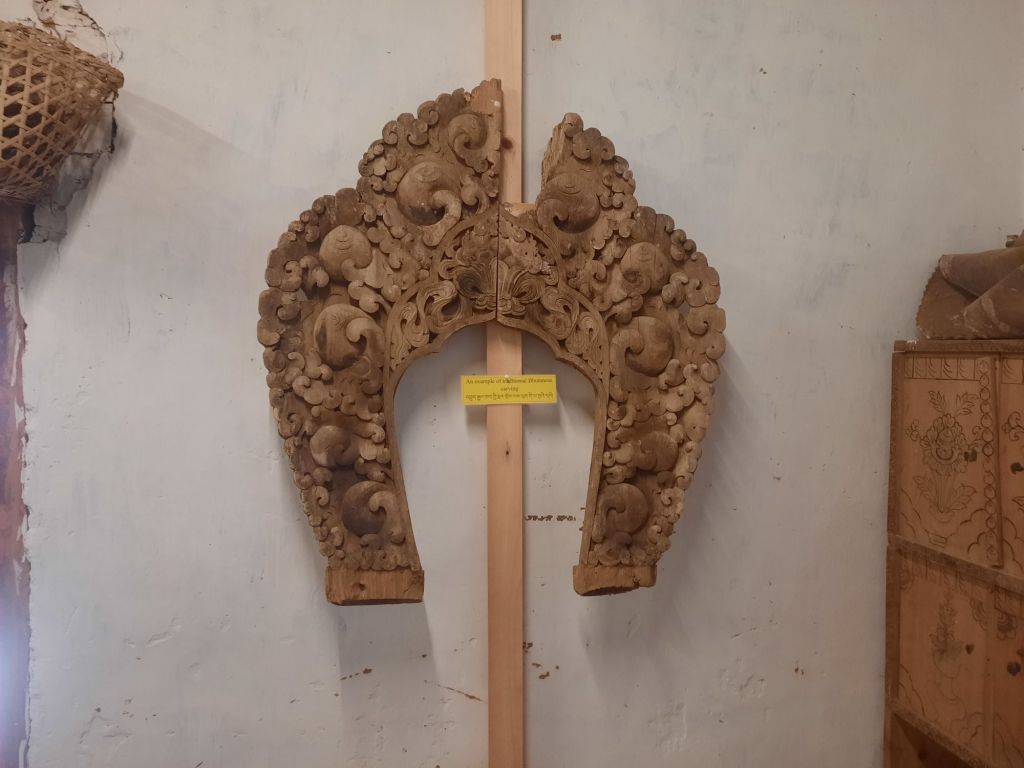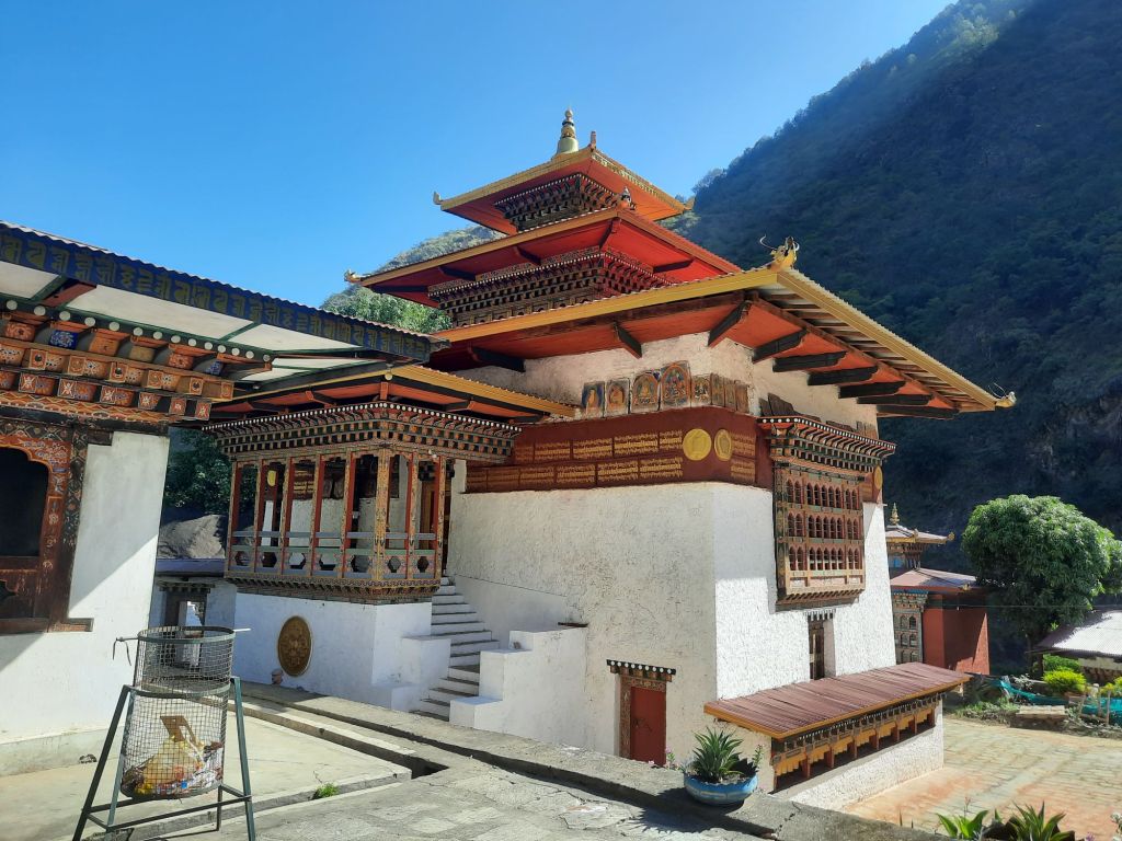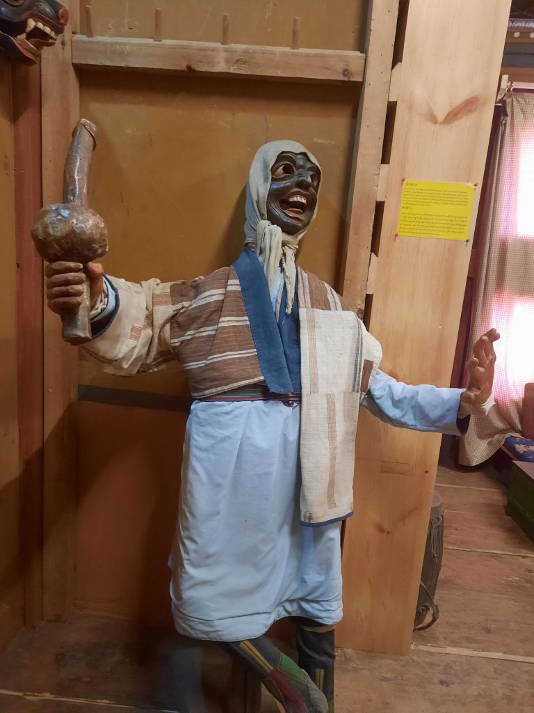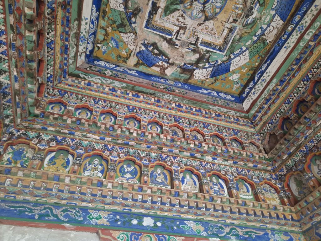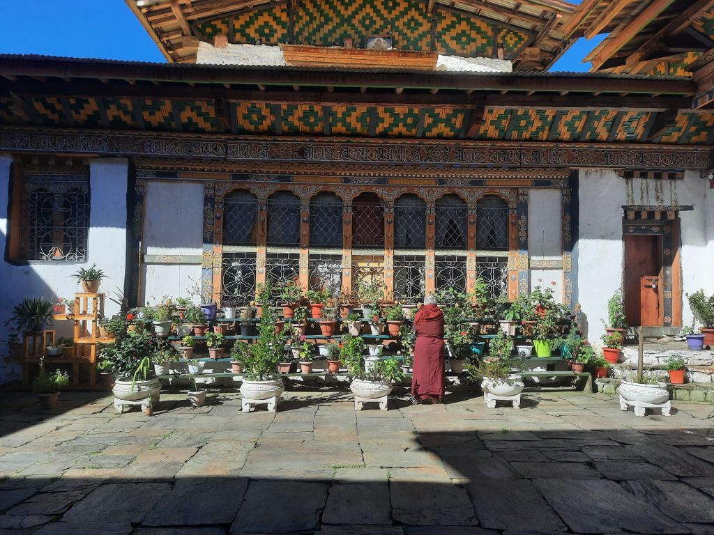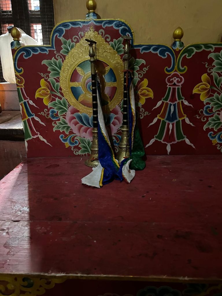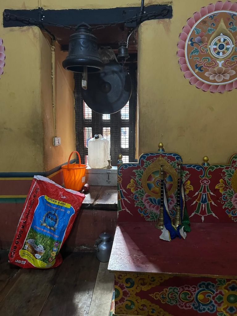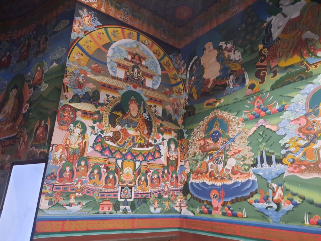 Dan verder over slingerweg omhoog. Hoog op de beg staat het huis van een grote Tibetaanse meester die in de 14de eeuw naar Buthan kwam. Longchen Rabjám bouwde hier een groot complex. De familie woonde hier eeuwen lang. De kinderen van de laatste generatie besloot te gaan studeren. Na de studie keerde ze terug en besloten het huis op te knappen en er een museum van te maken. Zeer mooi opgezet . 3 verdiepingen vh huis is te bezichtigen met een houten steile trap. Achter de gebedsrollen staan hier zeer oude klei tabletten met verschillende Boeddha’s.